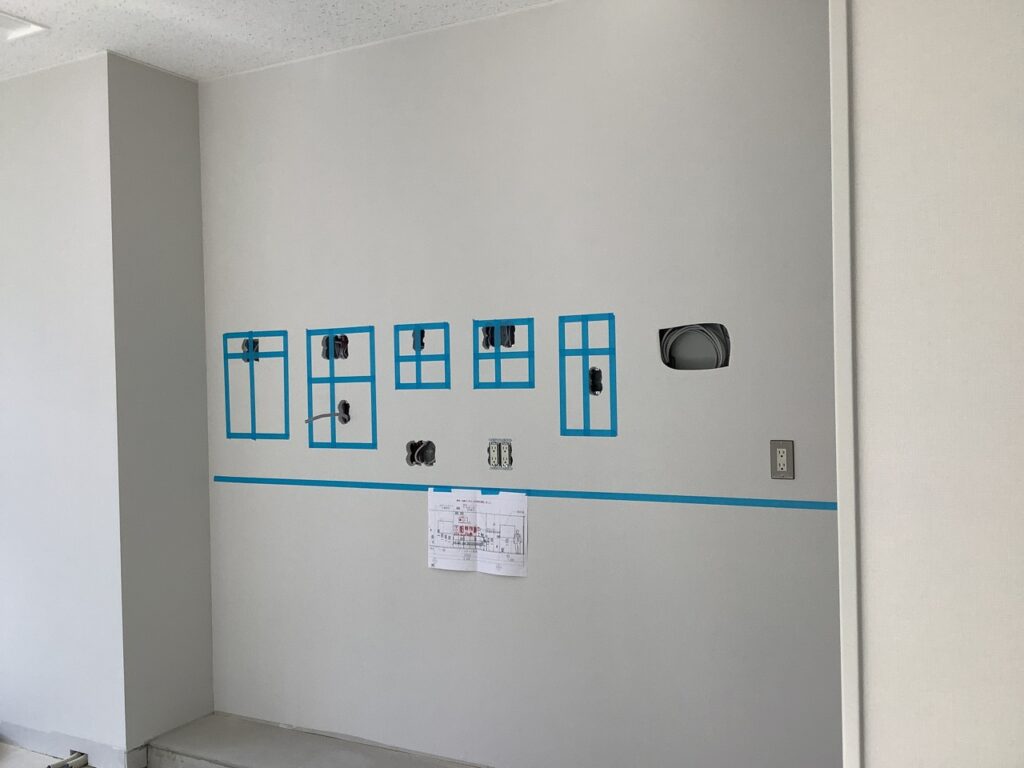 操作盤など取り付ける場所の確認をする為、マスキングテープでシュミレーションしているところでした!